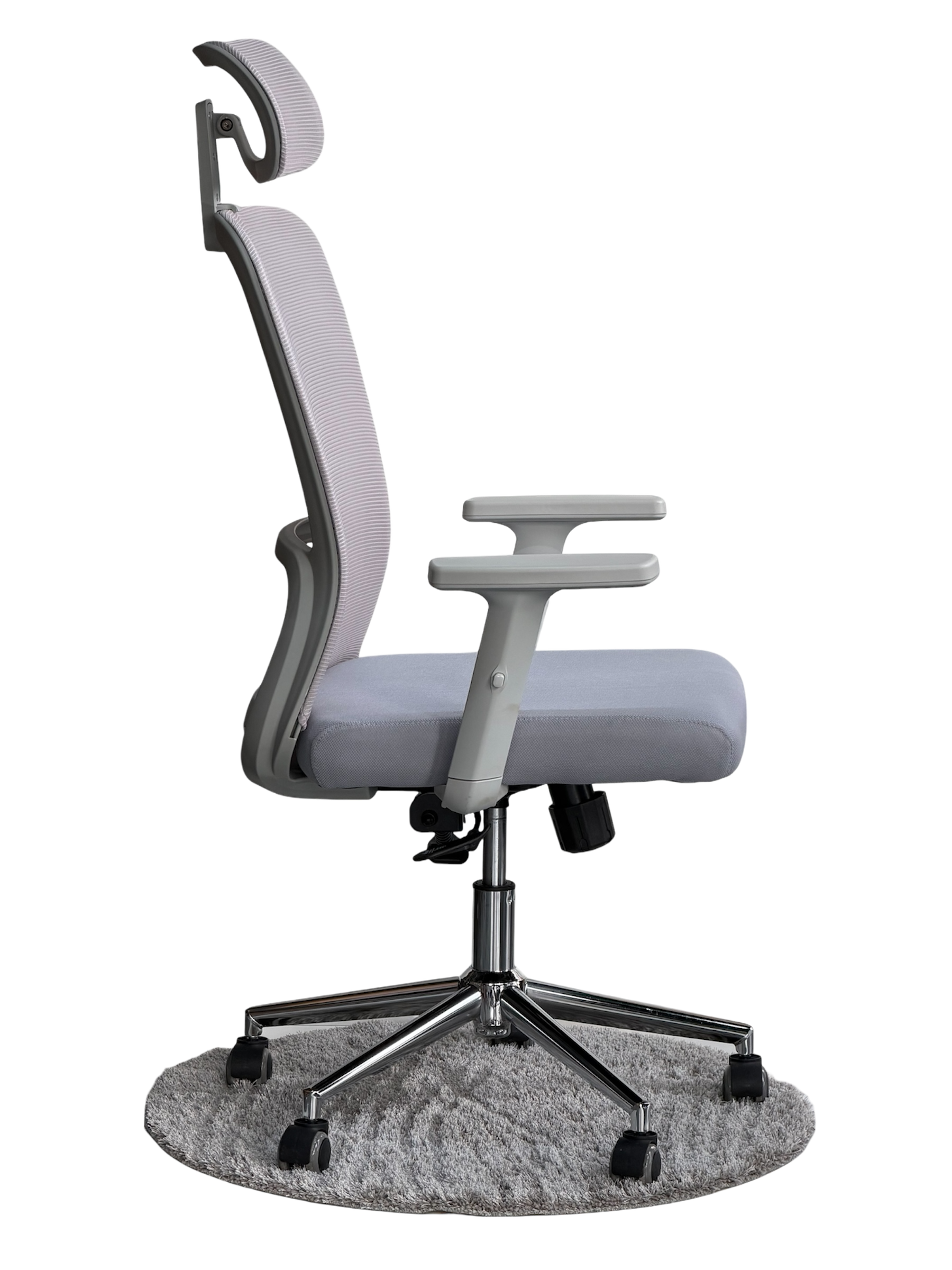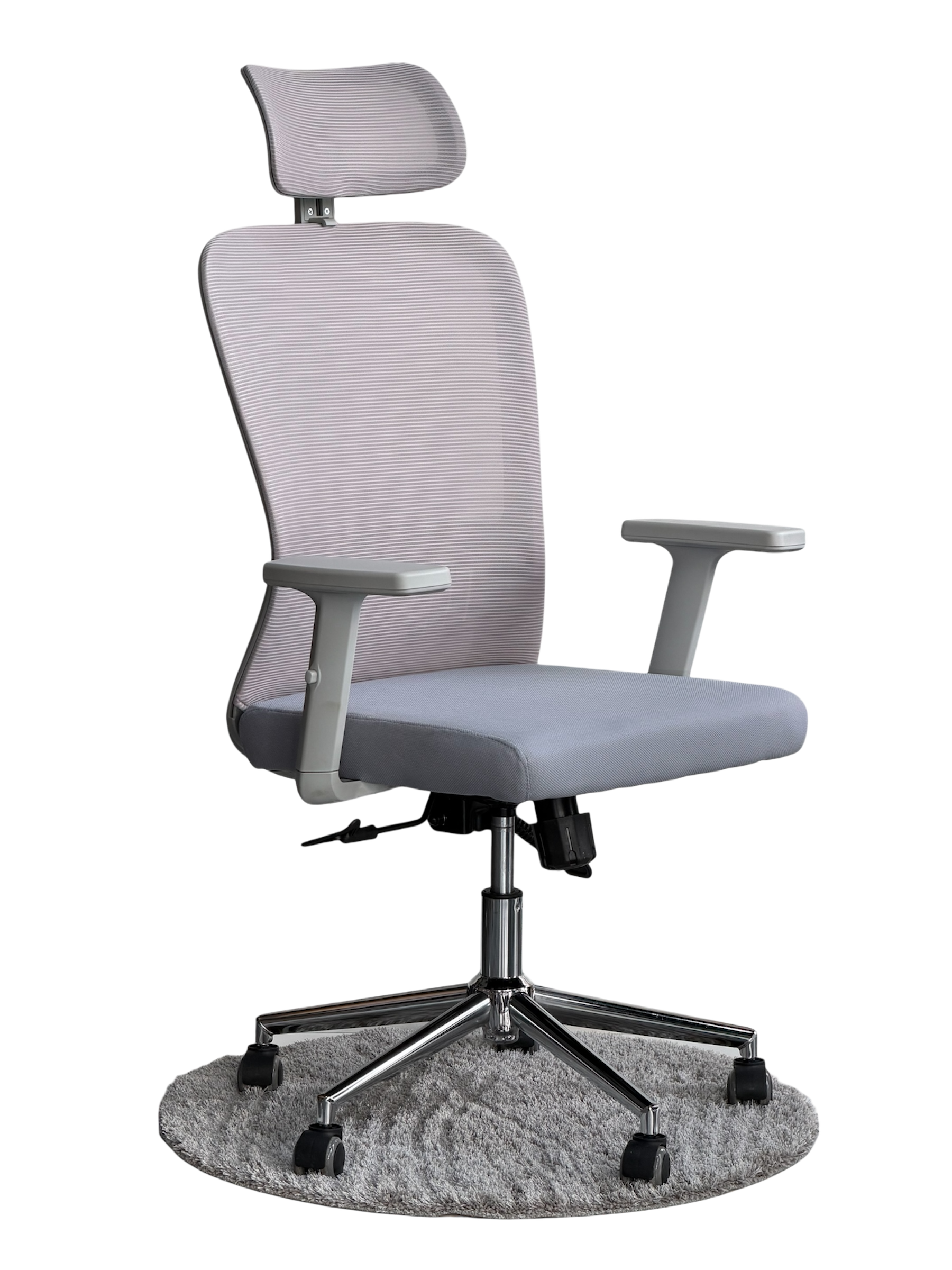 Karrige ergonomike në ngjyrë hiri me model rrjete që kombinon rehati, frymëmarrje dhe dizajn modern.
